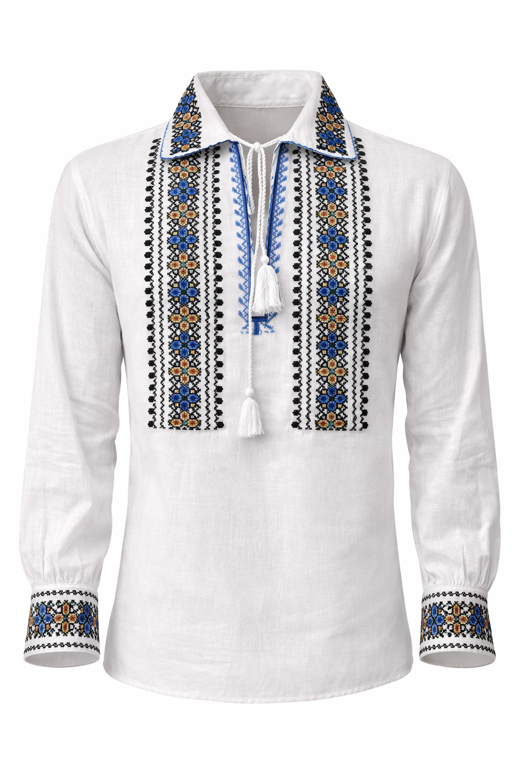 Cămașă tradițională bărbătească din bumbac alb, cu broderie tradiționala pe piept, guler și manșete. Elegantă și comodă, perfectă pentru evenimente cu specific tradițional sau ținute casual.